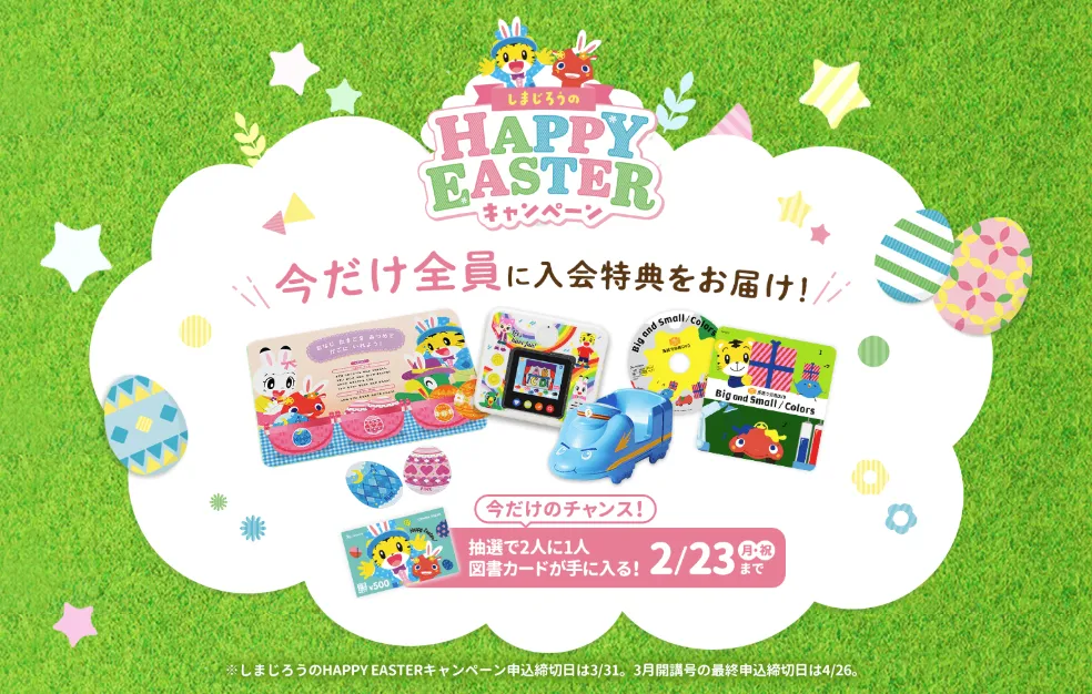 - 期間限定入会特典「にぎにぎしまじろうと手ざわり布絵本」プレゼント